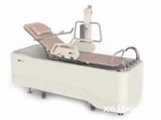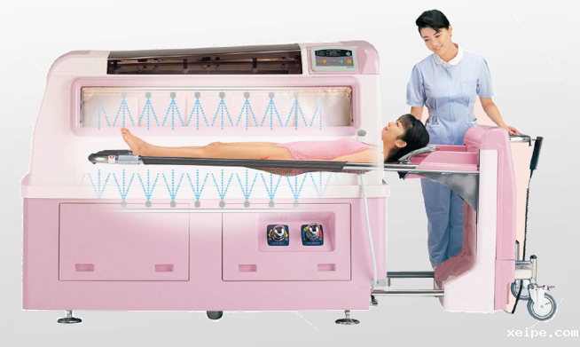 将入浴推车推到配套的助浴浴缸旁,按电动控制的上升键,非常安静舒缓地抬升到最高位后,再推入浴缸上再按下降健入浴推车落入浴缸内,可在浴缸内洗头,淋浴。